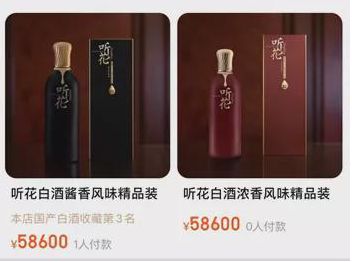 目前,電商平台上共有四款商品售賣,其中兩款濃香風味,兩款醬香風味,兩種口味的定價均是標準版5860元/瓶,精品裝58600元/瓶。據介紹,其精品版選用10年以上特級醇熟原酒,經過更多重精餾與定向濃縮,只有約1/16的精華酒體才能成為聽花精品。