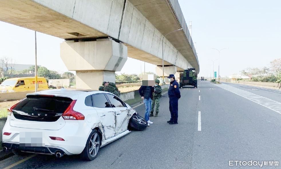 蘆竹警方調查,30歲的黃姓男子駕駛有「瑞典坦克」封號的富豪轎車,行經蘆竹區南青路外側車道往高鐵青埔站方向行駛,軍方裝甲車由外側車道變換至內側車道時,與直行的黃姓男子轎車發生碰撞,其中富豪轎車右側車身嚴重毀損,右前輪軸疑斷裂,所幸雙方人員均未受傷。