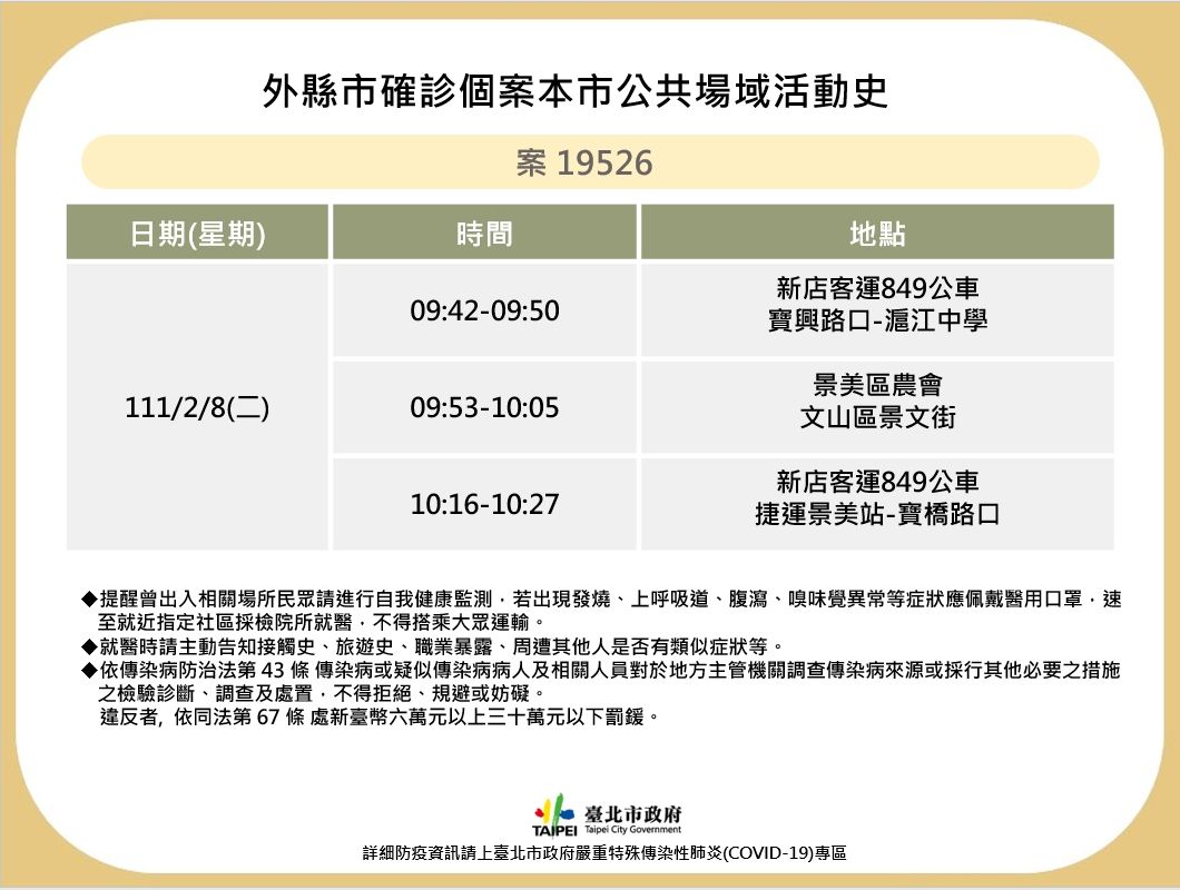 新北市今新增3例居家隔離陰轉陽個案,其中,案19526為居住在新店的50多歲女性,已接種3劑疫苗,Ct值僅16。其台北市足跡包括:2月8日搭乘新店客運849公車(寶興路口站至滬江中學站)、景美區農會、新店客運849公車(捷運景美站至寶橋路口站);北市衛生局表示,相關足跡皆已完成環境清消。