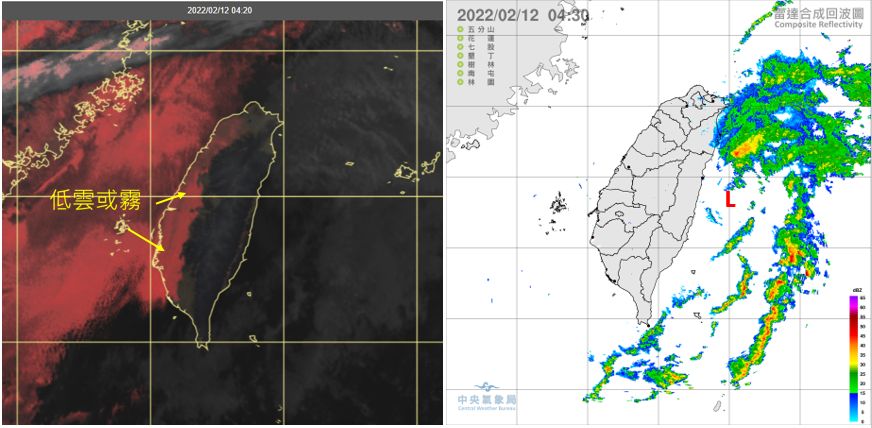 ▼12日4:20真實色雲圖顯示,西半部已有局部霧(左圖)。4:30降水回波合成圖顯示,降水回波大多在台灣東側海面,圍繞著花蓮東方的低壓中心(右圖)。(圖/翻攝三立準氣象· 老大洩天機)