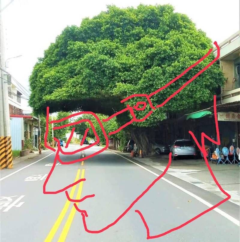 臉書社團「爆廢公社」許姓網友po出這一張照片,地點就在埔鹽鄉員鹿路上,樹長到約3層樓高,綠葉扶疏,最奇特的就是左下方懸空,有一個完整的切口,乍看就像戴了一頂安全帽,引發網友熱議,頓時成為打卡熱點。