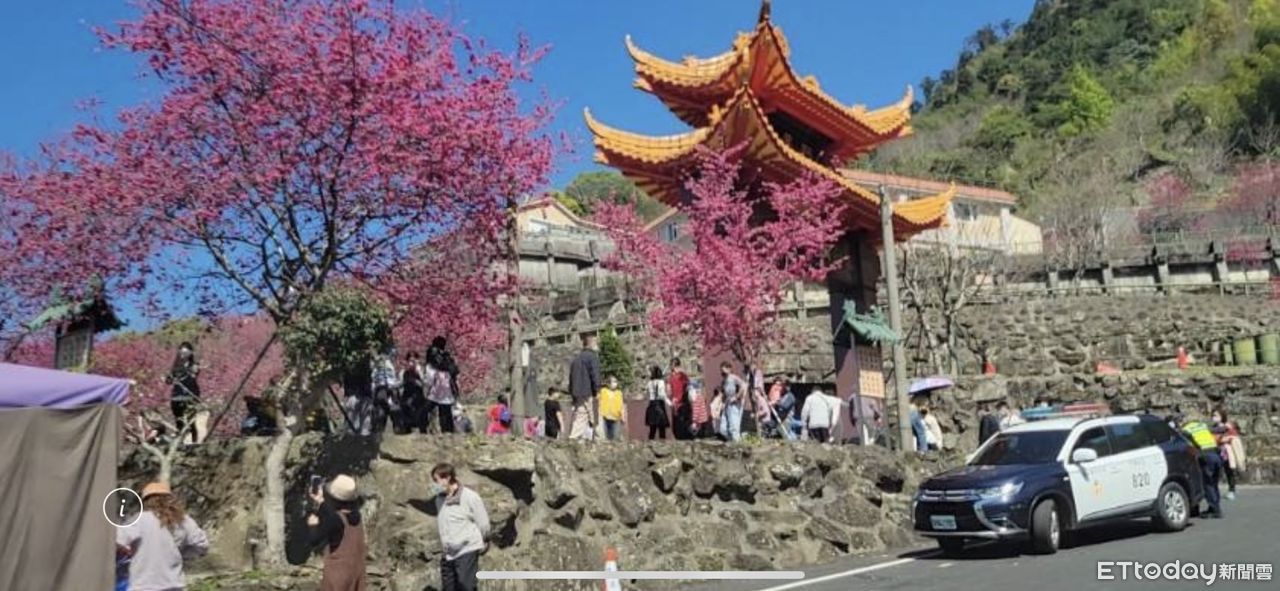 ▲嘉義番路彌陀禪寺櫻花盛開,出動當地警方紓解交通並加以管制。(圖/中埔分局提供)