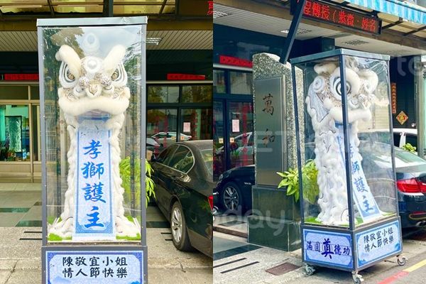 傅先生14日早上10點多就把情人節禮物送達了公司門口,因為真的很顯目,讓路過的人都忍不住看兩眼,因為上頭除了有表達對老婆的愛,「情人節快樂」字樣之外,還有一對用玻璃展示櫃裝起來的獅頭,咬著寫有「孝獅護主」的白色幛字。