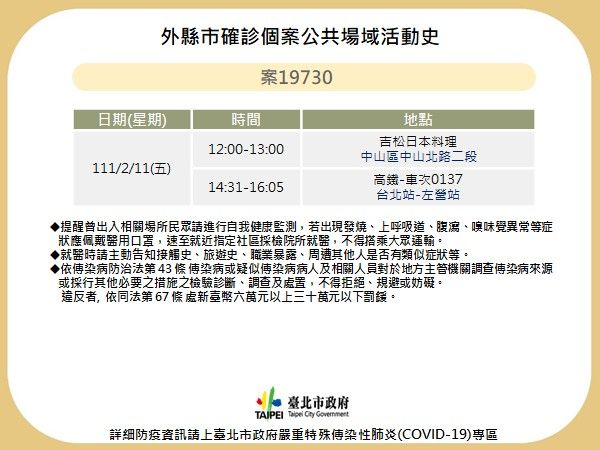 北市衛生局表示,案19730於2月13日準備出境前至醫院採檢 PCR陽性確診,相關足跡已完成清消。台北市副市長黃珊珊公布該案足跡,呼籲民眾若身體有不對勁盡快做快篩。