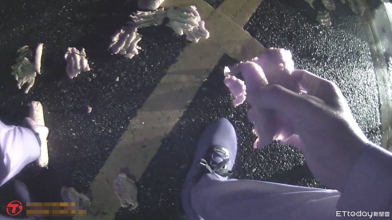 ▲菜販黑輪掉滿地,警方協助清理。(圖/記者楊漢聲翻攝)