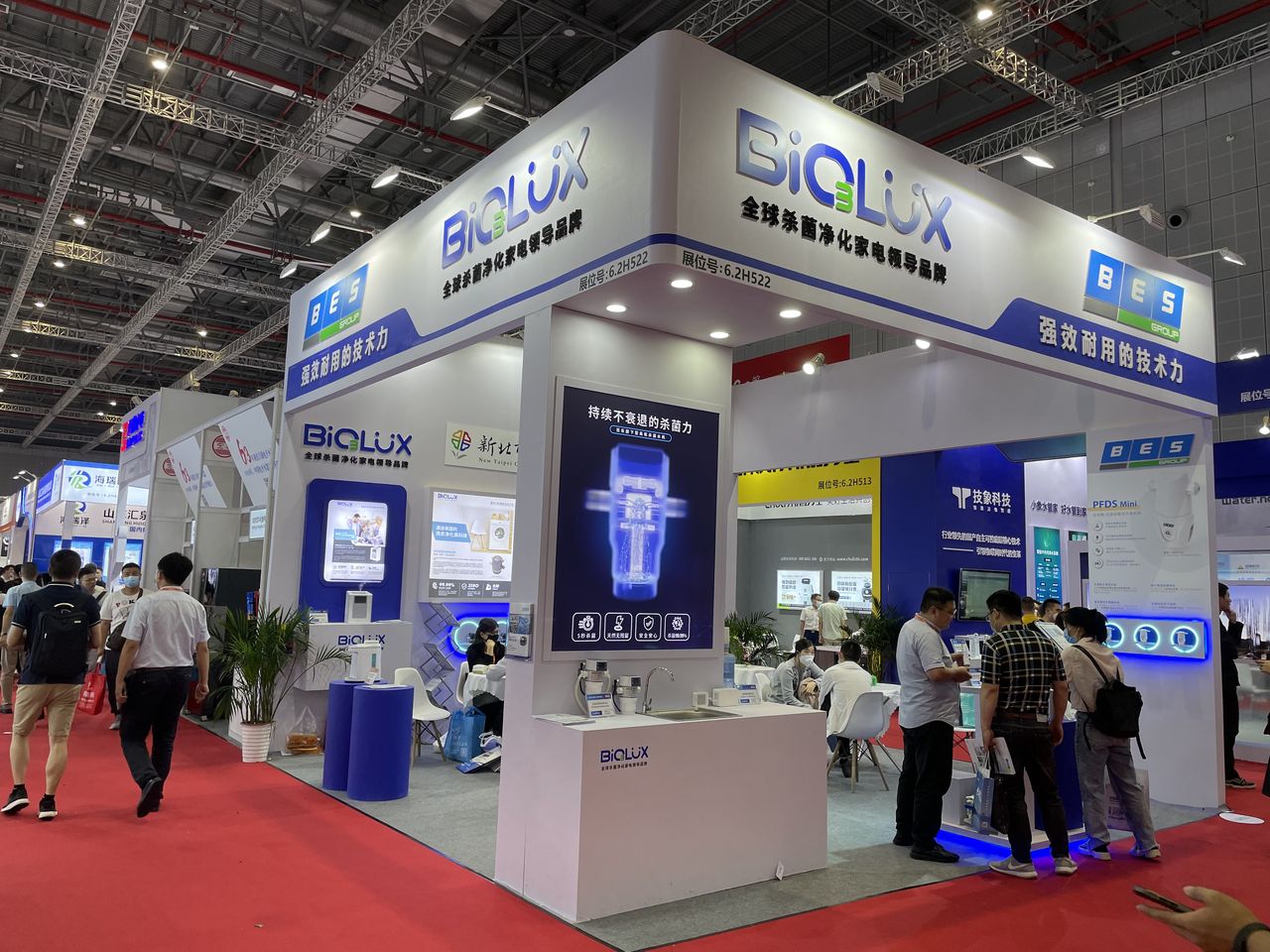 去(110)年雖受疫情衝擊,許多廠商仍把握機會,在疫情相對緩和之下積極參與國際展覽,例如百特環保科技股份有限公司參加「第十四屆上海國際水處理展」(如上圖),其為領先業界的電解式臭氧殺菌設備製造商,並以「全自動過濾後管線殺菌系統」為展售品,在展期中帶來了超過200萬元的商機;國內參展補助,華堂光學實業公司為國內擁有最多放大鏡品項的光學儀器廠商,參加「ATLife2021 臺灣輔具暨長期照護大展」,爭取到逾150萬元的訂單。透過補助業者參加國內外展覽,多方拓展貿易商機,增加廠商的曝光率。