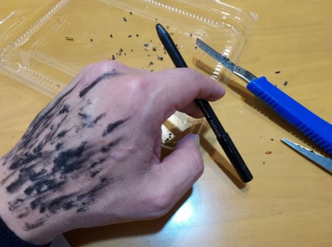 原PO在臉書「爆怨2公社」PO出一張照片,只見他左手拿著眼線筆,手背畫滿黑色的線條,桌上放著美工刀和剪刀,桌面還有不少黑色碎屑;他說,「把女兒的眉筆(後更正為眼線筆)越削越短,怎麼辦?急,線上等。手起刀落3天3夜沒闔眼,我就問你會不會削啊?」