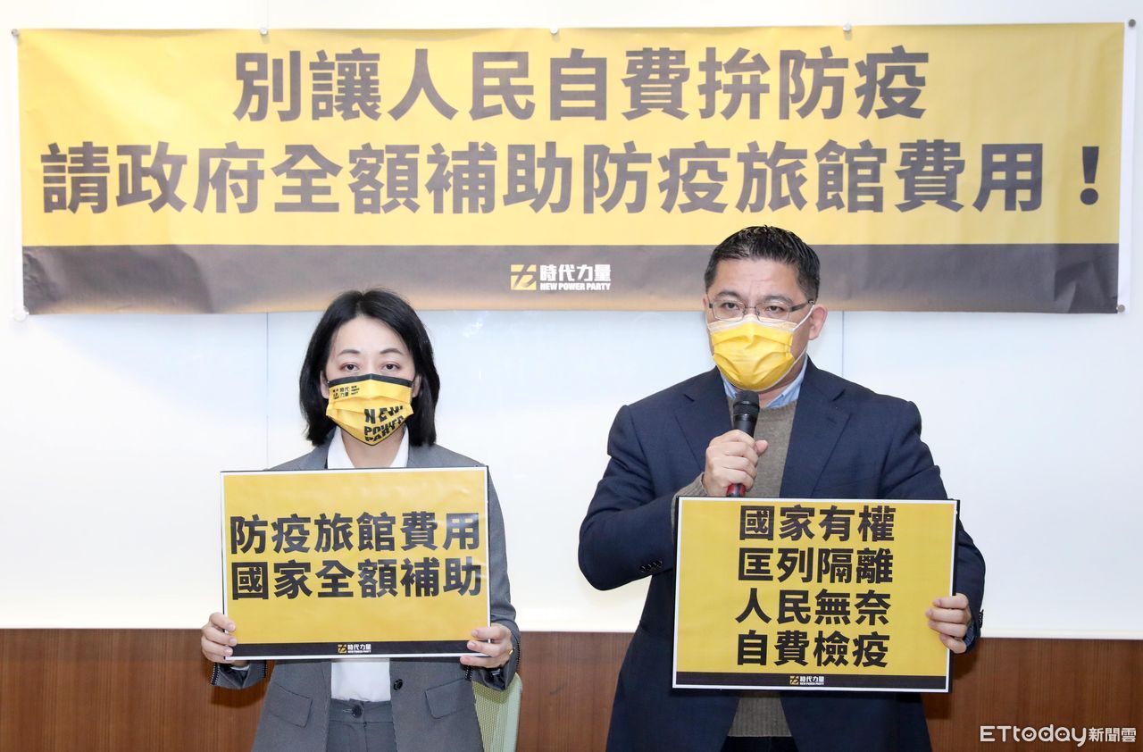 時代力量立委邱顯智、王婉諭16日上午在立法院召開「別讓人民自費拚防疫,請政府全額補助防疫旅館費用!」記者會,呼籲政府應支付民眾遭匡列隔離時集中檢疫所及防疫旅館之費用。