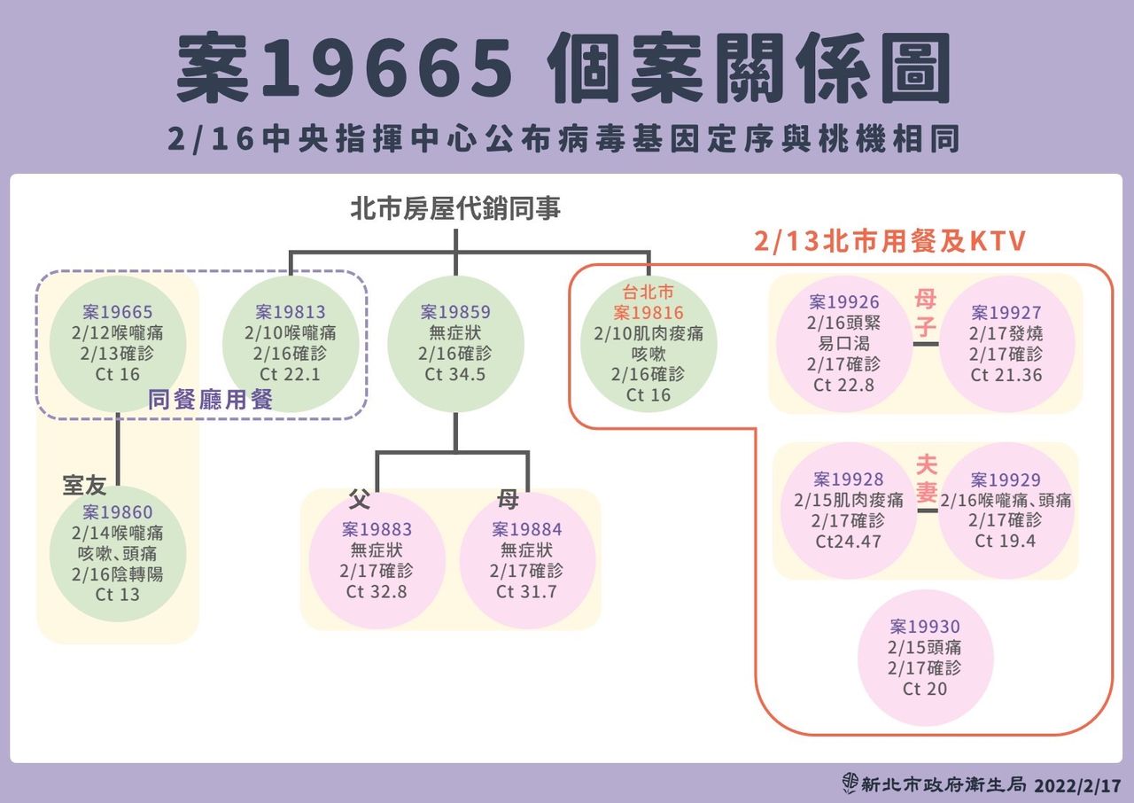 案19665於2/13確診,不料經疫調,陸續匡列出室友、曾同桌用餐的房屋代銷公司人員確診。