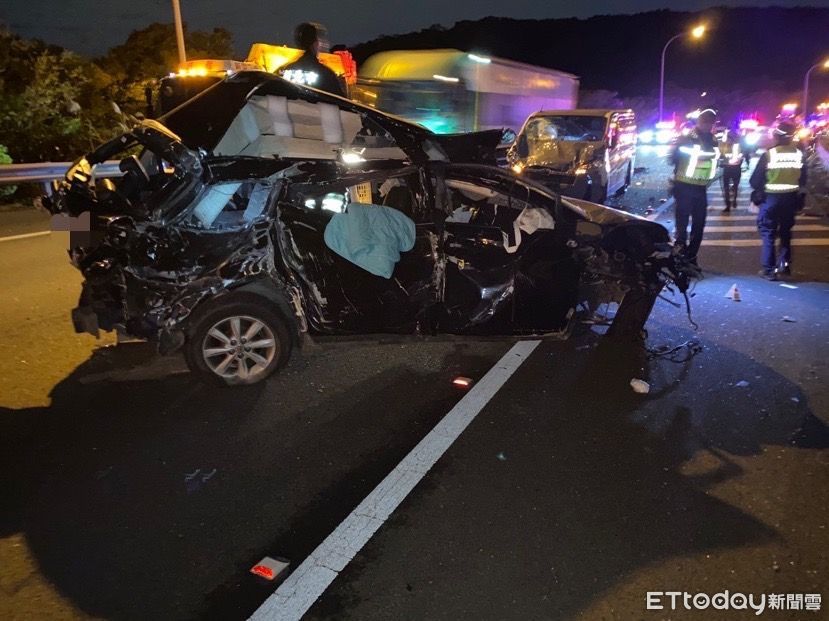 ▲男子酒駕上國道,高速自撞護欄後再被後方廂型車追撞,整輛轎車變得稀巴爛。(圖/記者陳雕文翻攝)