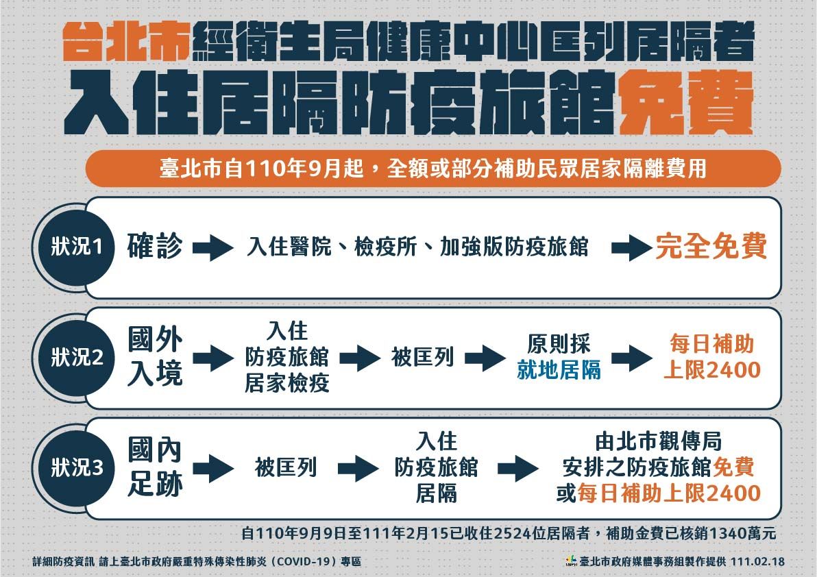 市府強調,台北市從去年9月起,即全額或部分補助民眾居家隔離費用;如果確診,不管入住醫院、檢疫所、加強版防疫旅館完全免費。如果國外入境,入住防疫旅館居家檢疫卻被匡列(如飛機前後排乘客確診),原則採「就地居隔」,每日補助上限2400元,有時完全免費。