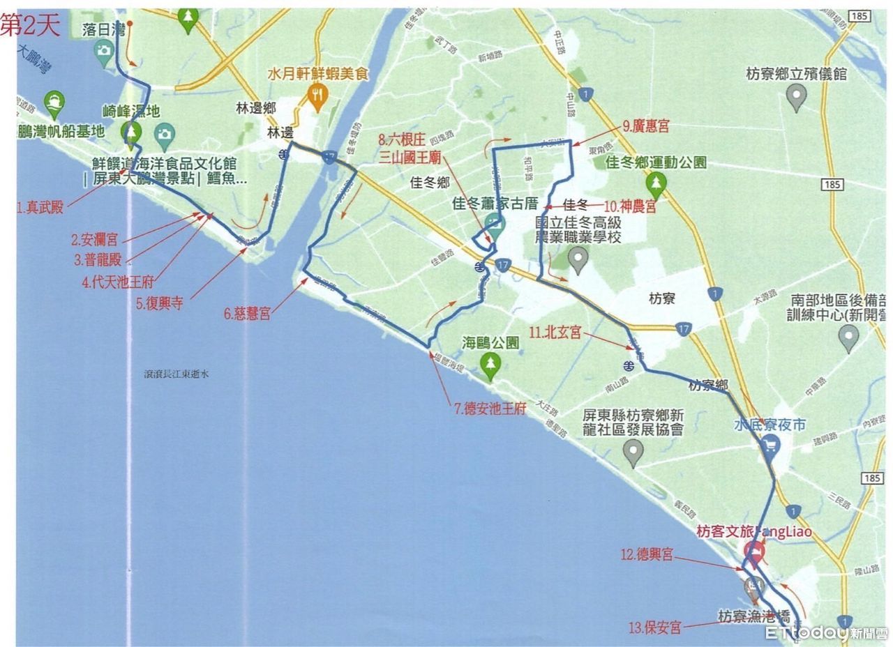 枋寮警方表示,據目前的路線圖,遶境隊伍將從台17線林邊大橋入轄,行經佳冬鄉各路段,由於路幅狹窄且車輛不易通行,枋警將加強前後路口兩端交通疏導,以維持遶境隊伍交通順暢;預計傍晚時段進入枋寮鄉台1線五岔路口,沿台1線右轉進入枋寮市區,行經德興路、保生路、金榮路及中山路至夜宿地點。