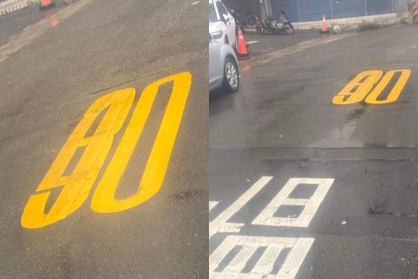臉書「爆料公社」管理員20日分享一名網友的貼文,只見照片中的路面還有些許積水,地上畫著一個白色的慢字,但再往上一看,限速的黃色數字卻長得有些奇怪,像是被人先畫上30再改成40,讓他超級疑惑,「請問這裡究竟限速是多少?」