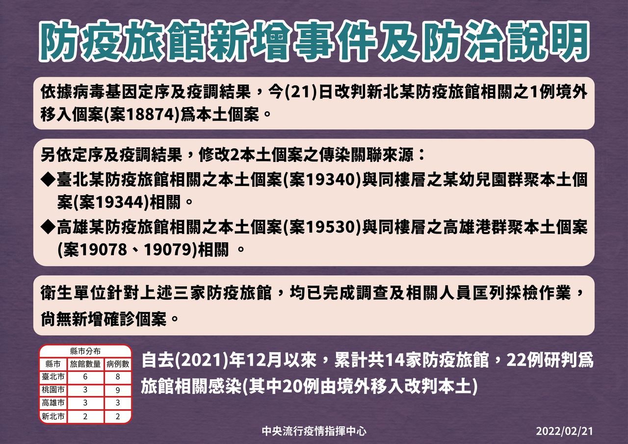 中央流行疫情指揮中心今(21)日公布3例防疫旅館相關個案,其中一案與高雄砂石場有關,指揮官陳時中表示,經調查發現案19530可能是在防疫旅館遭高雄港群聚本土個案(案19078、19709)交互感染,感染源已釐清,目前不明感染源剩下8條,且都在收斂中。