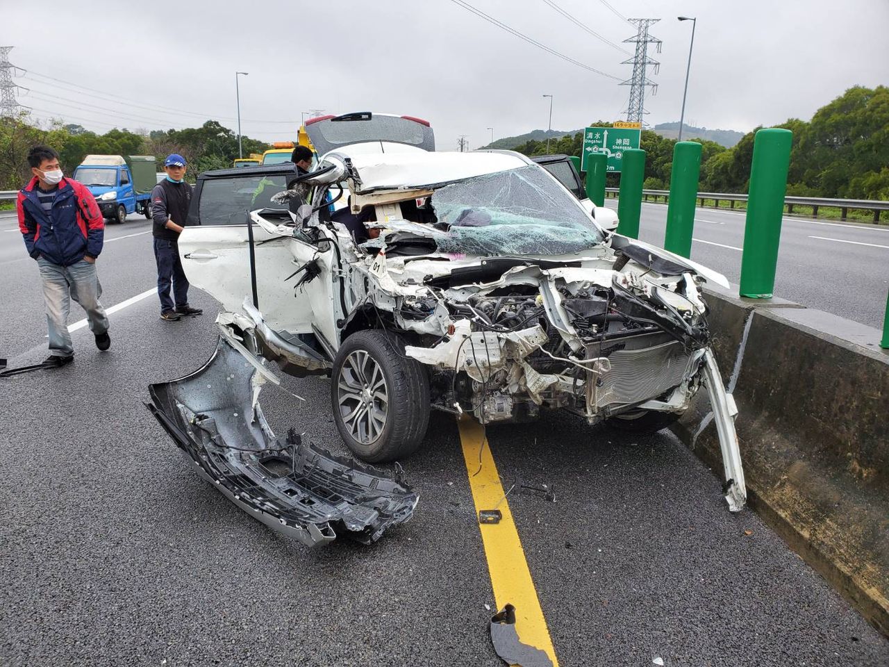 ▲▼國三南下171.5k車禍,自小客車引擎被削去大半,女乘客無生命跡象。(圖/民眾提供)