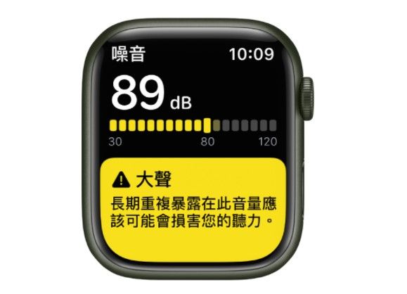 Apple Watch SE 與 Apple Watch Series 4 和後續機型上的「噪音」App 會使用麥克風和暴露期間來測量周遭的環境音量。當 Apple Watch 偵測到分貝數上升到可能會影響聽力的程度時,會透過輕點手腕來通知。
