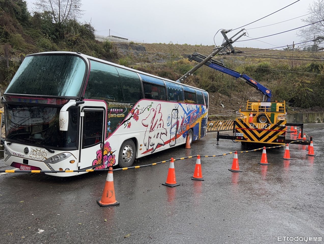 ▲大雨沖刷邊坡崩塌,梨山傳電桿斷裂砸中遊覽車。(圖/台電提供,下同)