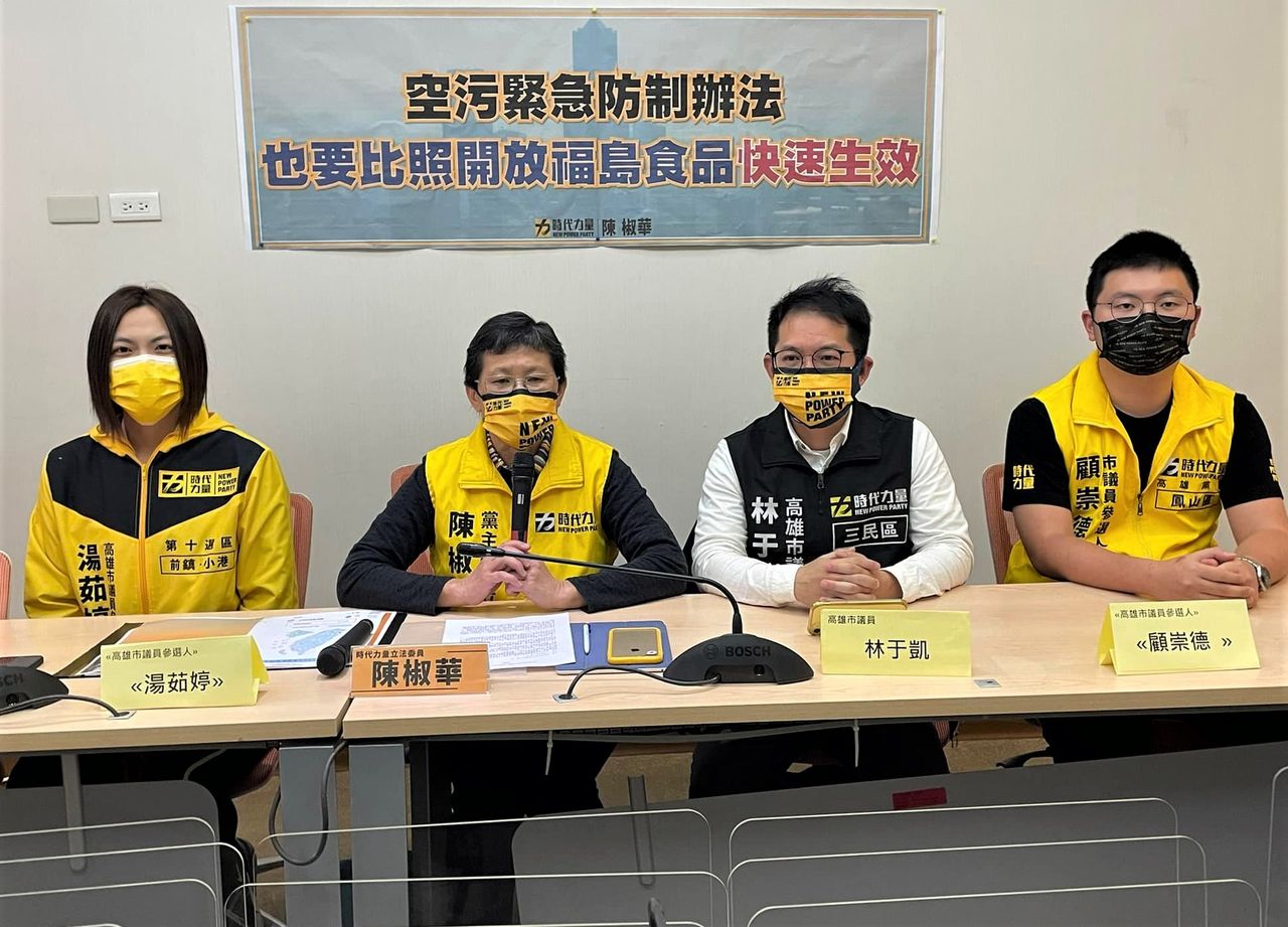 陳椒華24日上午偕同時代力量高雄市議員林于凱、時代力量高雄市議員參選人湯茹婷、顧崇德等人,在立法院共同召開「空污緊急防制辦法也要比照開放福島食品快速生效」記者會,並邀請環保署空氣品質保護及噪音管制處科長蕭培元等官員列席。