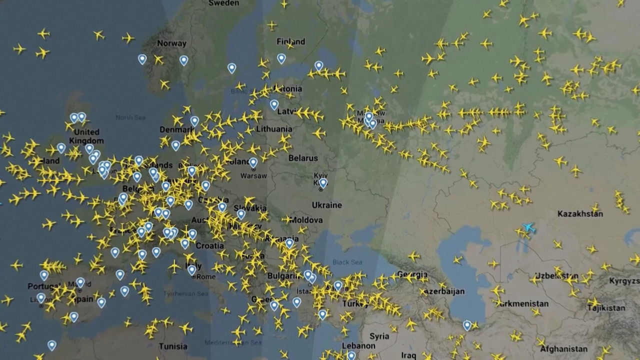 俄羅斯24日向烏克蘭展開軍事行動,烏克蘭以「高度安全風險」為由關閉全國領空。歐洲飛航安全局則警告,飛行於烏俄、白俄邊境可能會遭受軍事攻擊,提醒飛機務必避開。根據飛航追蹤網站FlightRadar24截圖顯示,烏克蘭領空已經淨空,所有民航機全都繞道而行,造成罕見「空洞」景象。
