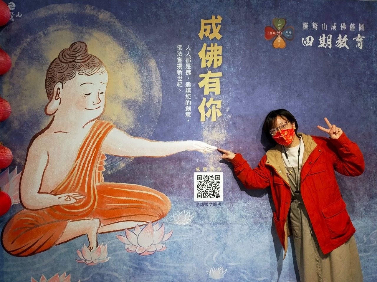 成佛有你,到靈鷲山與佛心手相連!文化走廊前,網路插畫家貓魚參考米開朗基羅「創造亞當」世界名畫,創作260公分的「成佛有你」巨幅海報牆,相當吸晴,佛陀與小嬰兒指尖互碰的設計,象徵每個人與天俱來的佛性與覺性,大家在海報牆前擺出各種姿勢拍照,請佛摸頭加持或一指相連,完成屬於自己的世紀名畫,壬寅虎年開春至今,成了人氣旺旺新景點,二二八連假歡迎上山與佛有約。