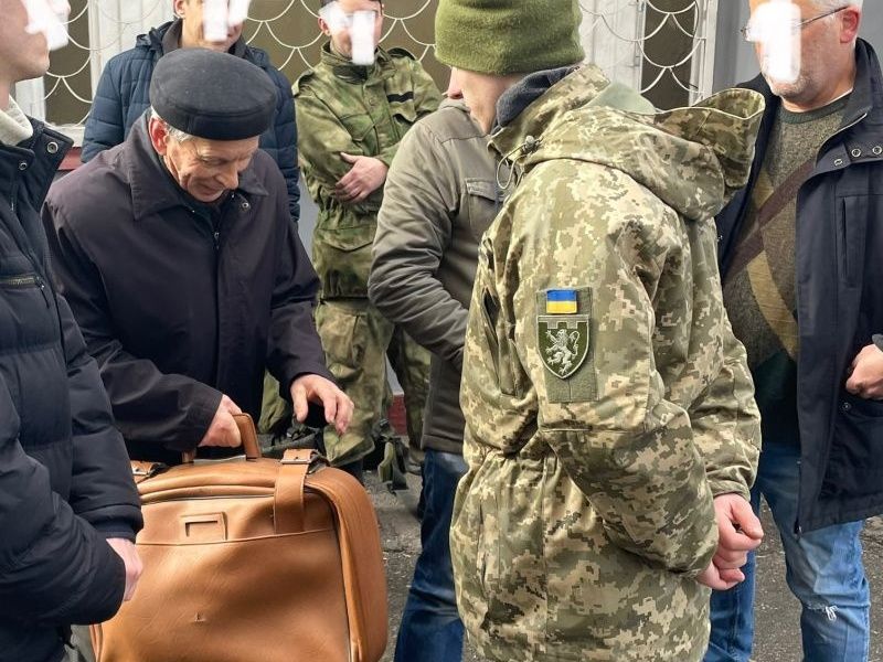 烏克蘭網友尤先科(Kateryna Yushchenko)在推特貼出一張照片,發文寫道「有人發了一張這位80歲的老人想參軍的照片,他隨身帶著一個小箱子,裡面有兩件T-shirt、一件額外的褲子,一支牙刷和幾個拿來當午餐的三明治,他說他是為了孫子們這麼做的。」