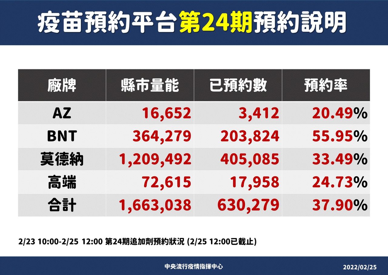 ▲指揮中心2/25公布第24期疫苗預約數據。(圖/指揮中心提供)