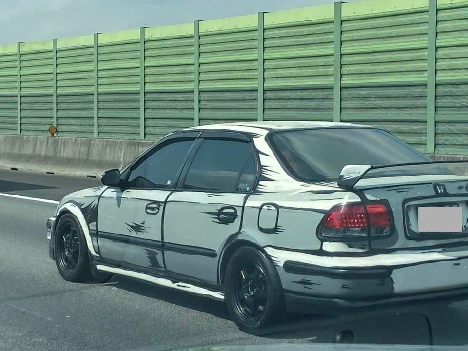 原PO在臉書社團「爆廢公社二館」說,他日前乘車在高速公路上看見一輛特殊轎車,轎車主體是白色的,但被塗上特殊風格的黑色花紋後,像是漫畫《頭文字D》中的車輛,真的出現在現實世界一般,讓他直呼「根本是行走的漫畫」。