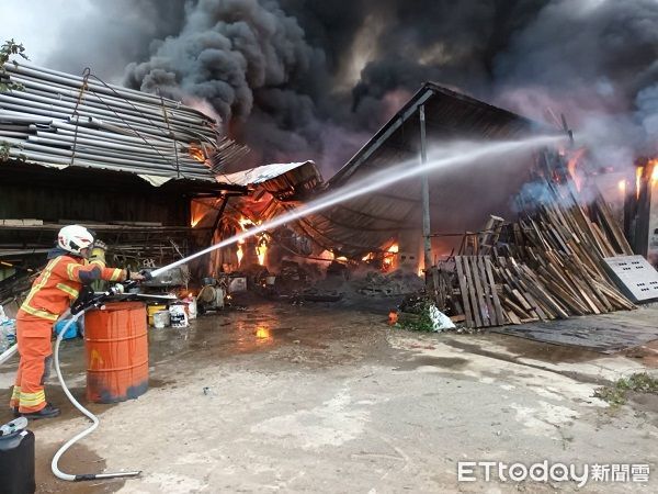 ▲▼消防人員全力灌救,但因堆積模板等易燃物,火勢迅速將廠房燒塌,並波及一部轎車。(圖/桃園消防局提供)