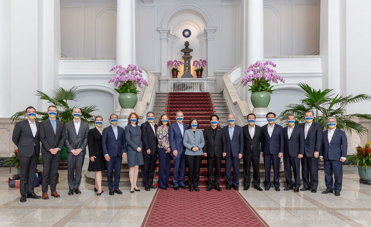 ▲總統蔡英文、副總統賴清德晚間於總統府宴請拜登特使團,台美一起戴上「力挺烏克蘭」口罩。(圖/總統府提供)