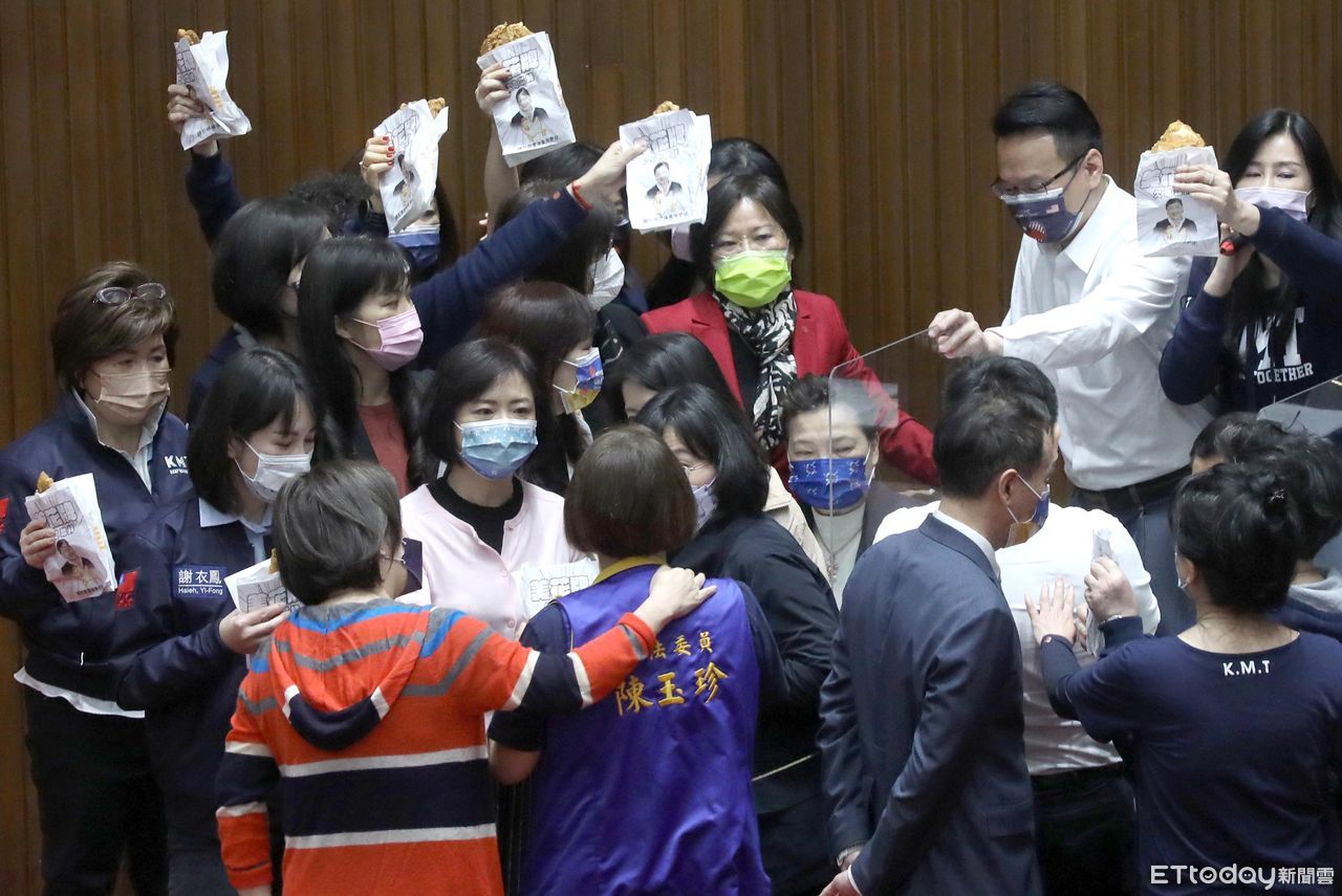 ▲國民黨團拿雞排抗議,要求王美花下台。(圖/記者屠惠剛攝,下同)