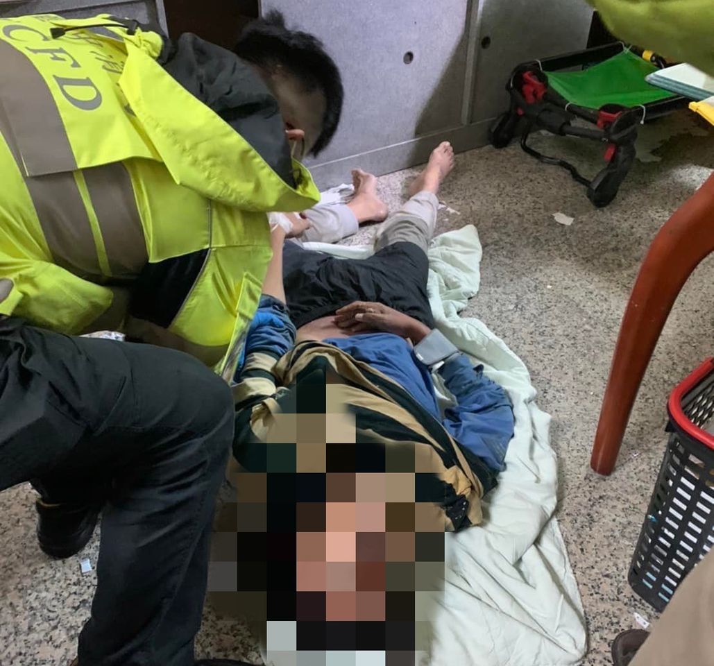 眾人見狀慌了手腳,不知道如何是好,整個現場亂糟糟,員警冷靜沉穩的指揮,協助檢視男子生命徵象,初步研判張男疑似急性中風,四肢無法動彈倒地,時間已達1週之久,長期間滴水未沾,身體早已僵直、麻痺,僅靠殘存的求生意志支撐。