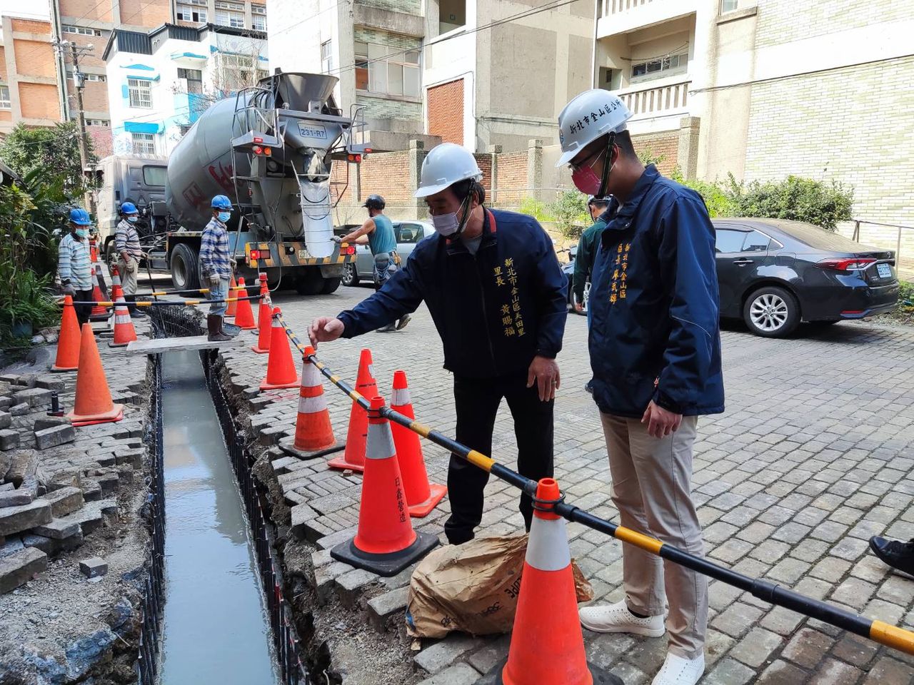 金山區長廖武輝表示,本案工程由公所執行,現場增設寬30公分、深度40公分,總長約95公尺側溝,預計3月底完工,目前施工現場已完整佈設交維措施,導引車流動線,提醒民眾配合現場交維,預計3月底完成施工,屆時將降低周邊巷道雨水漫流情形,大大提升民眾居住生活環境,也讓學生有個良好的通學用路品質。