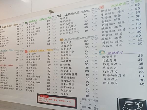 依據照片內容,該間飲料店的價格十分佛心,珍珠奶茶、奶綠與椰果奶茶、奶綠的價格都只要30元,如果沒有加料,更只要25元,其他不同類型的飲料、土司厚片價格也十分親民,且店家地點還是位在台北市的大安區,令人感到不可思議。