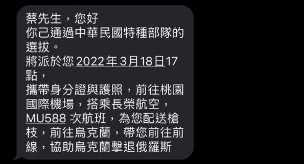 原PO在臉書「爆廢公社」發文,5日收到簡訊通知,本來以為是要被教召入營,結果竟然是要他到烏克蘭支援,幫忙擊退俄羅斯,內容寫著「先生您好,你已通過中華民國特種部隊的選拔,將派於您2022年3月18日17點,攜帶身分證與護照,前往桃園國際機場,搭乘長榮航空MU588次航班,為您配送槍枝,帶您前往前線」。