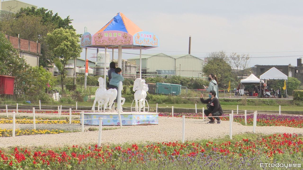 結合綠色市集、在地廟會傳統文化,現場更發放500份平安餐給民眾,一旁還有大片花海搭配摩天輪、旋轉木馬、巴黎鐵塔等裝置藝術,吸引不少人前來拍照打卡。