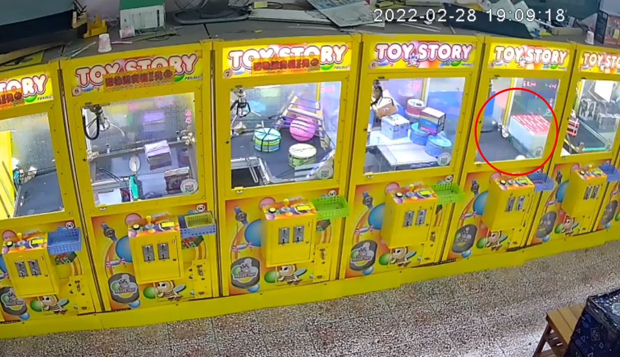 從畫面中可見,有8台並列的夾娃娃機台,拍攝時間為2/28晚間7時09分,店內空無一人,但其中一機台內2顆球狀物體卻莫名跳動了5秒,其他機台內的商品則沒有動靜。