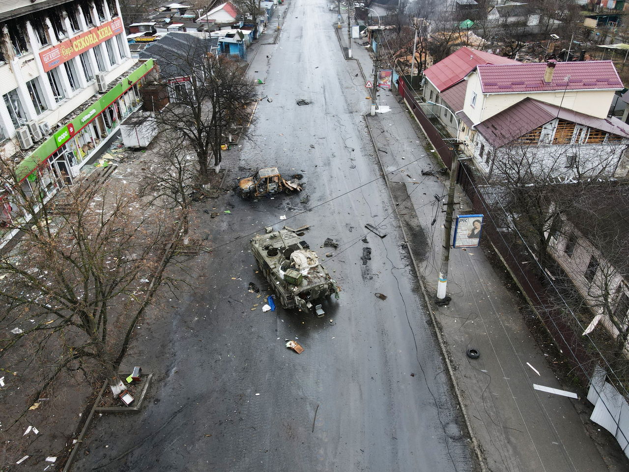 ▲俄軍入侵烏克蘭後,博羅江卡一條街道可以見到疑似俄軍裝甲車被摧毀。(圖/路透社)
