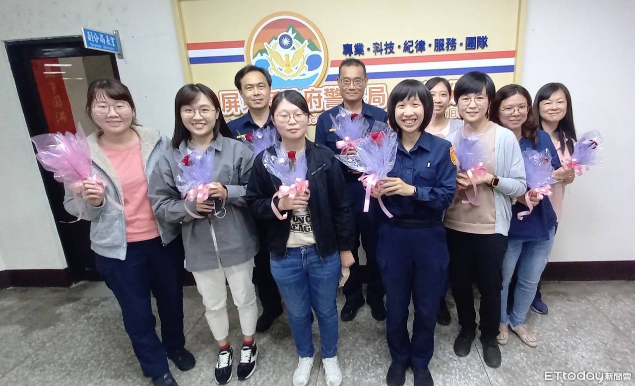 ▲三月八日國際婦女會,東港警分局長張世儒致贈女警、女志工玫瑰及巧克力表達祝福 。(圖/記者陳崑福翻攝,下同)