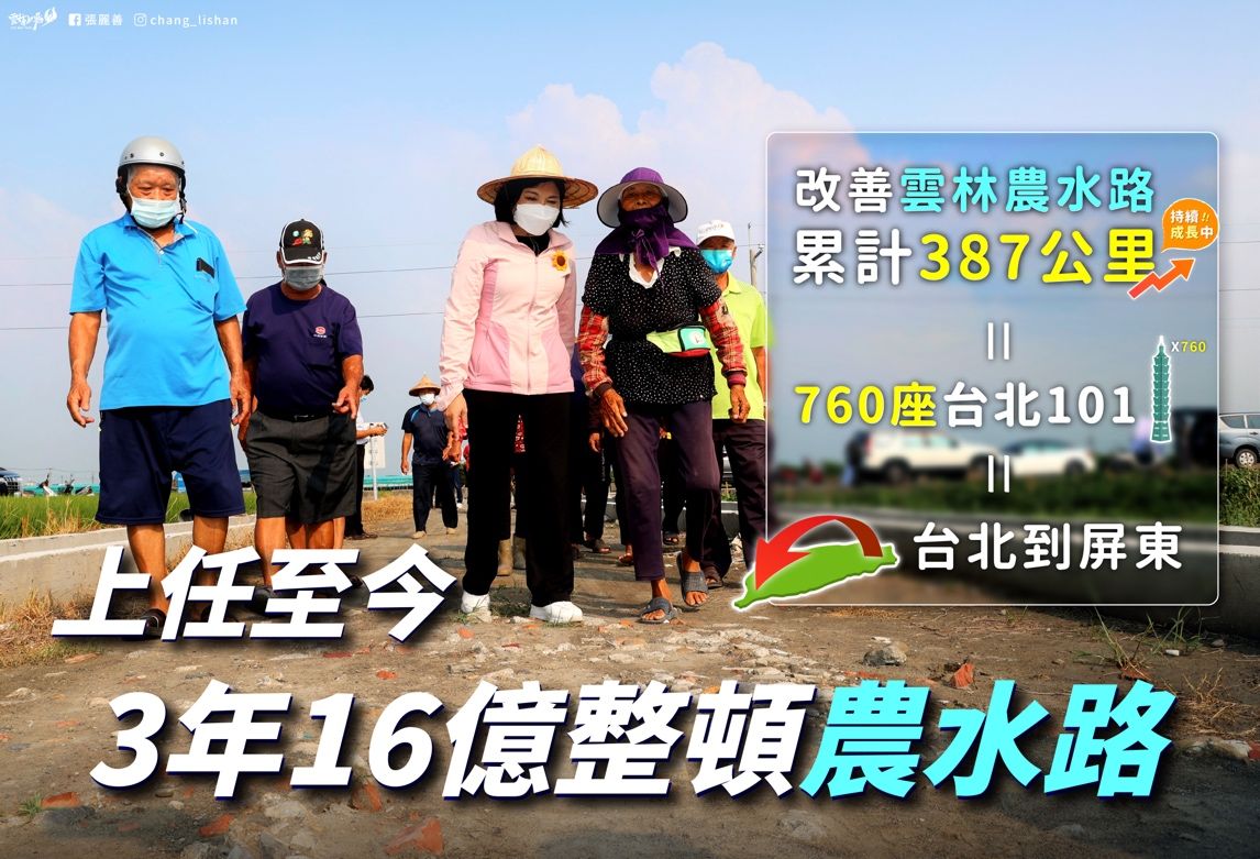 改善農地重劃區損壞的農水路,不但讓農產品運輸更便捷,更能提升農業生產效率。雲林縣縣長張麗善自110年起,每年由縣庫自籌1億元經費辦理農水路改善工程,此舉已打破過往的縣政紀錄,逐年更增加經費並積極向中央爭取預算,上任三年以來共投入16億預算,修建387公里長的農水路,此長度相當於760座臺北101的高度、也相當於從台北到屏東的距離!