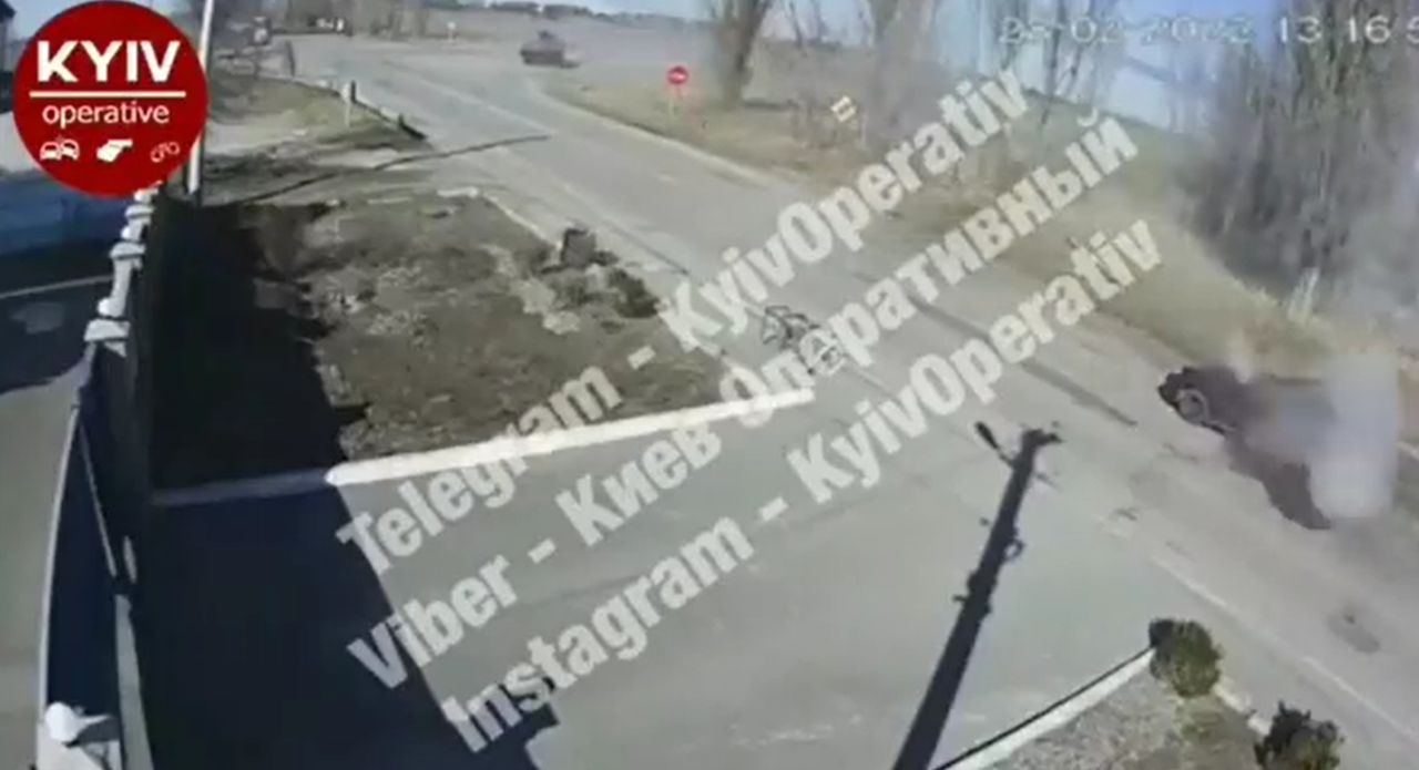 監視器的畫面中顯示,一輛烏克蘭民眾駕駛的汽車,看到遠方轉角處的一輛俄軍戰車,還未做出反應,就突然就遭到戰車連轟3砲,畫面也因此佈滿了硝煙,當硝煙散去之後,汽車已被轟到只剩下骨架。