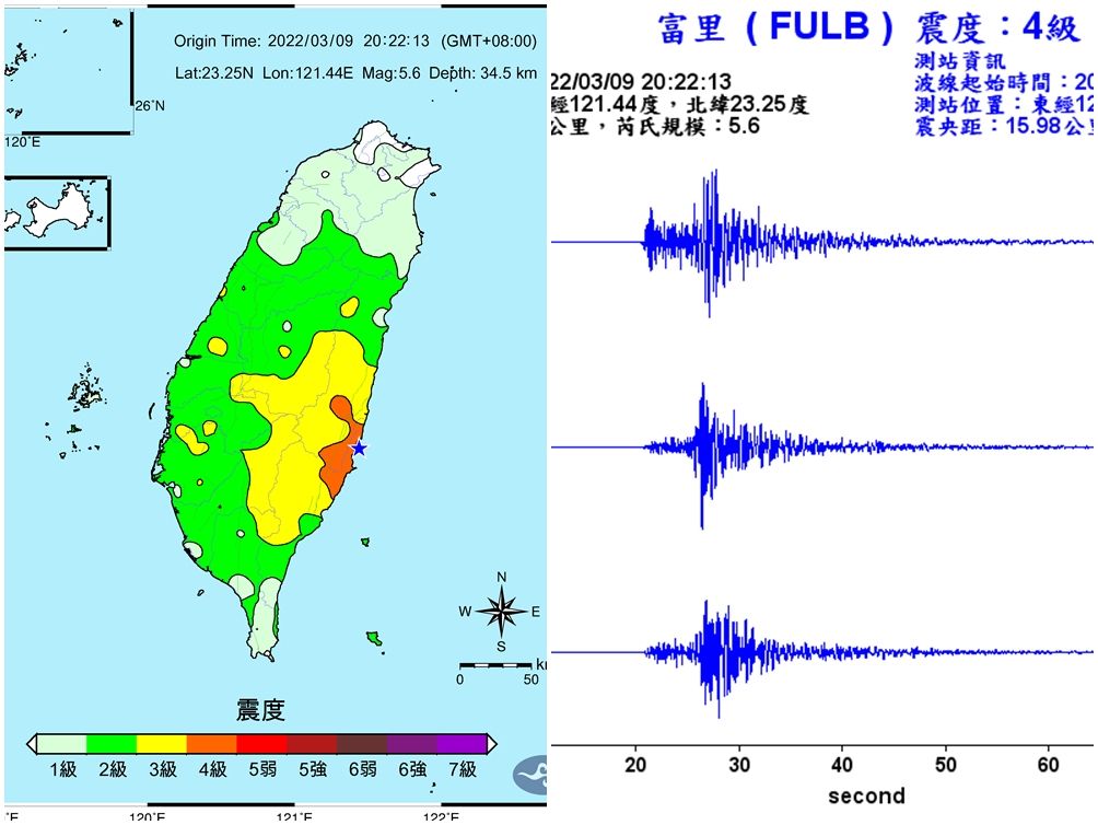 台東近海9日晚間8點22分發生規模5.6地震,最大震度4級,幾乎全台有感。地震過後,也立刻有網友驚恐表示,「幹台中超大」、「高雄很有感」、「這位置感覺不太妙」、「還以為飛彈打過來。」