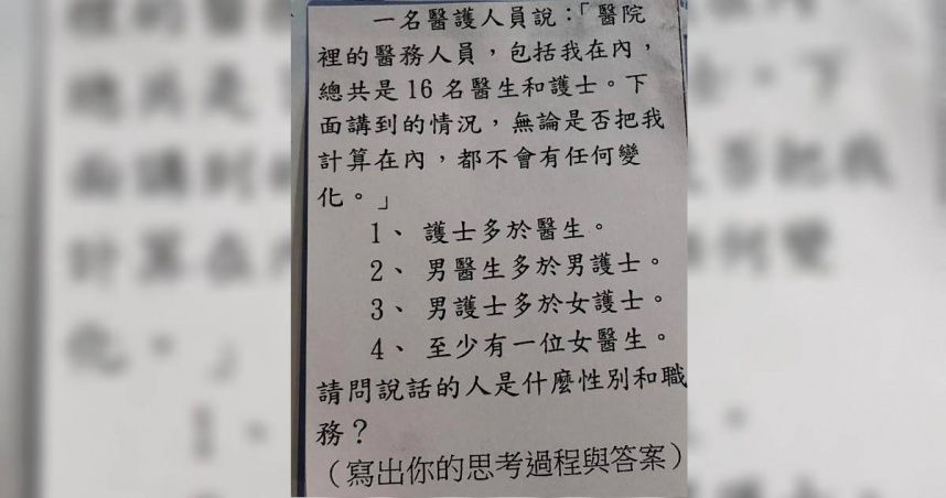 她也請粉絲一起試試算算看,「一名護理人員說:『醫院裡的醫務人員,包括我在內,總共是16名醫生和護士。下面講到的人員情況,無論是否把我計算在內,都不會有任何變化。(1)護士多於醫生。(2)男醫生多於男護士。(3)男護士多於女護士。(4)至少有一位女醫生。請問說話的人是什麼性別和職業?」。