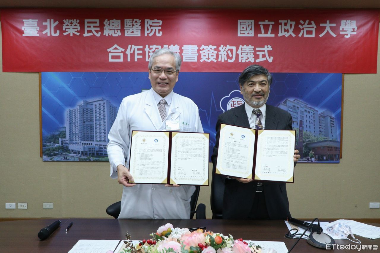 ▼政大校長郭明政(圖右)與與台北榮總院長陳威明(圖左)代表簽署產學合作協議。(圖/政大提供)