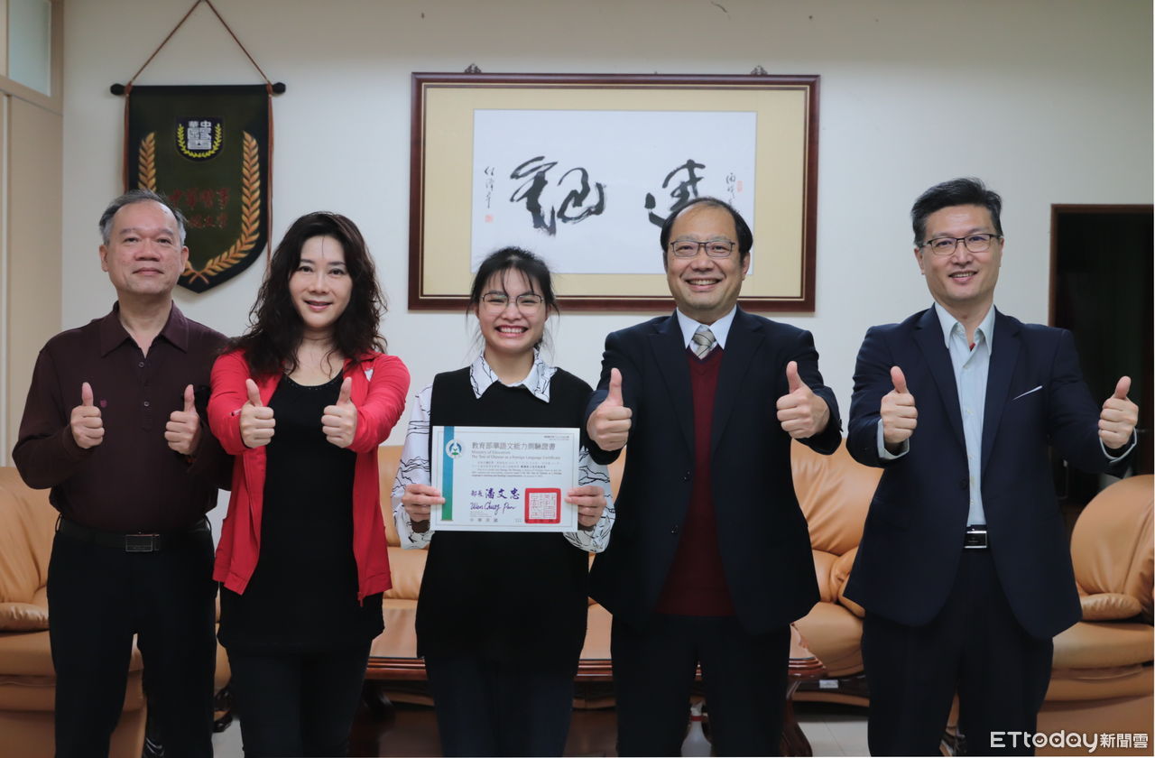 ▲來自越南的中華醫大新南向產學專班、化妝品應用與管理系學生黃氏芳(左三)通過教育部華語測驗C1流利級認證,開心與校長孫逸民(右二)等師長分享喜悅。(圖/記者林悅翻攝,下同)
