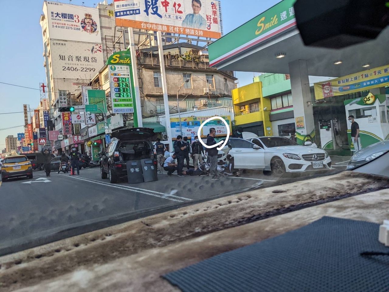 台中大里區中興路一處加油站11日下午發生槍戰!現場大批警力圍捕犯嫌,透過畫面可以看到,有一名黑衣男子被壓制在地,而至於詳細情形仍有待進一步調查釐清。
