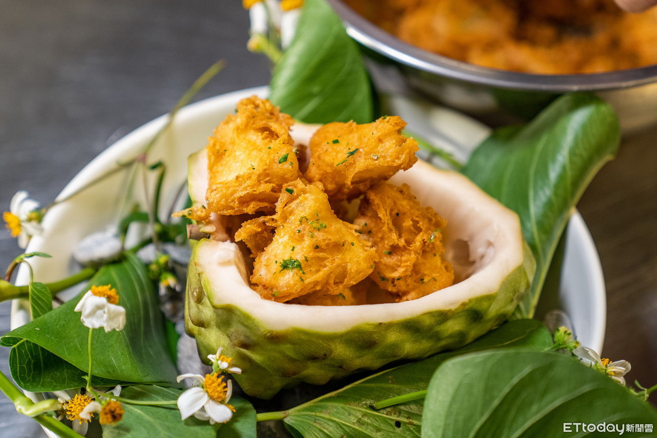 林主廚推出的第1道創意菜是釋迦冷沙拉,佐以鳳梨釋迦、蜂蜜與牛奶調成的醬料,搭配在地新鮮漁獲和當季水果;第2道為炸釋迦,主廚建議先原味品嘗,第2口再加上辣醬或擠上金桔汁食用。此外,主廚也分享烹調釋迦的秘訣,釋迦味道優雅獨特,不用做過多調味,而為了避免釋迦氧化變黑的現象,建議加入檸檬汁保持菜色美觀。