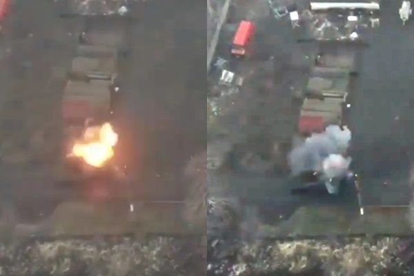 大約10秒後,烏軍發動攻擊,從空中射出砲火,直接衝向坦克的方向,並將其炸毀。砲彈擊中坦克後,現場傳出了一聲巨響,而坦克也被炸成一團橘紅火球,噴出黑灰色的濃煙。