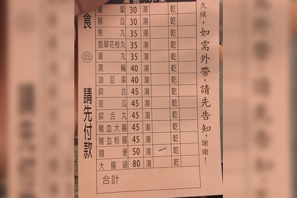 依據照片畫面,這碗「隨便」湯要價50元,與前面幾款品項相比,貴了5元到20元不等的價格,也難怪男子會以為是裡面的品項隨意添加幾樣,做成一碗湯。