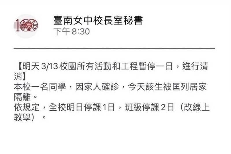 台南女中聲明,明天(3/14)校園所有活動和工程暫停一日,進行清消。本校一名同學,因家人確診,今天該生被匡列居家隔離,依規定,全校明日停課1日、班級停課2日(改線上教學)。