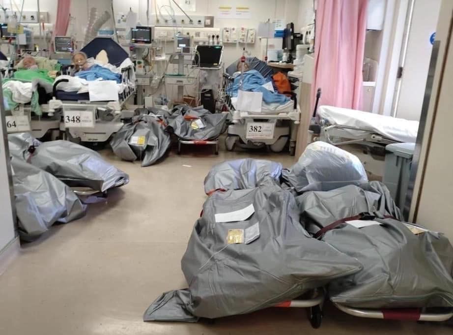 臉書社團「公務員secrets」近日PO出一張照片,稱「伊利沙伯醫院急症室實況!香港人做錯了什麼,生與死都這麼可憐」。畫面顯示,醫院內的病房有病患躺在床上接受治療,然而他們旁邊卻擺滿大量已過世的「遺體」!